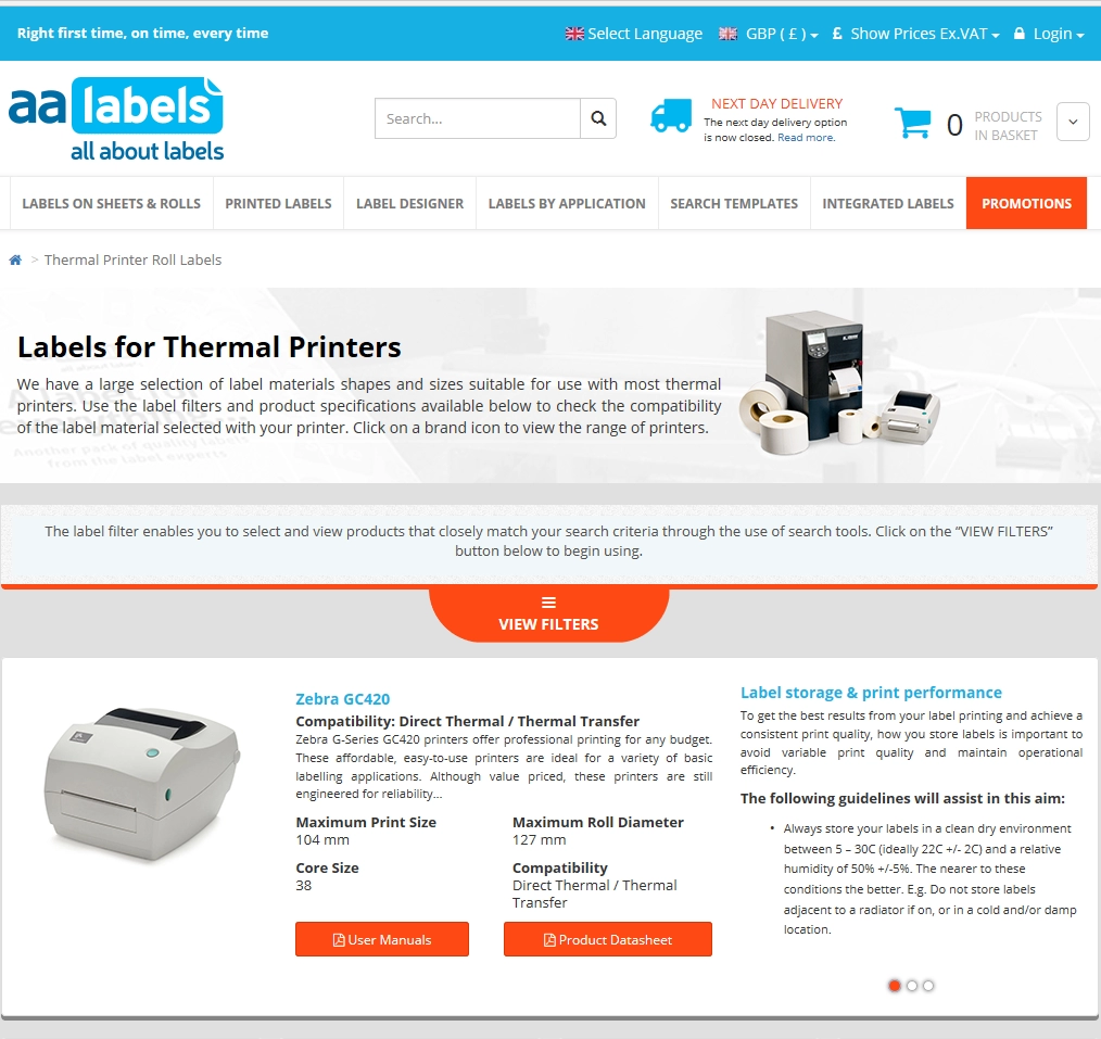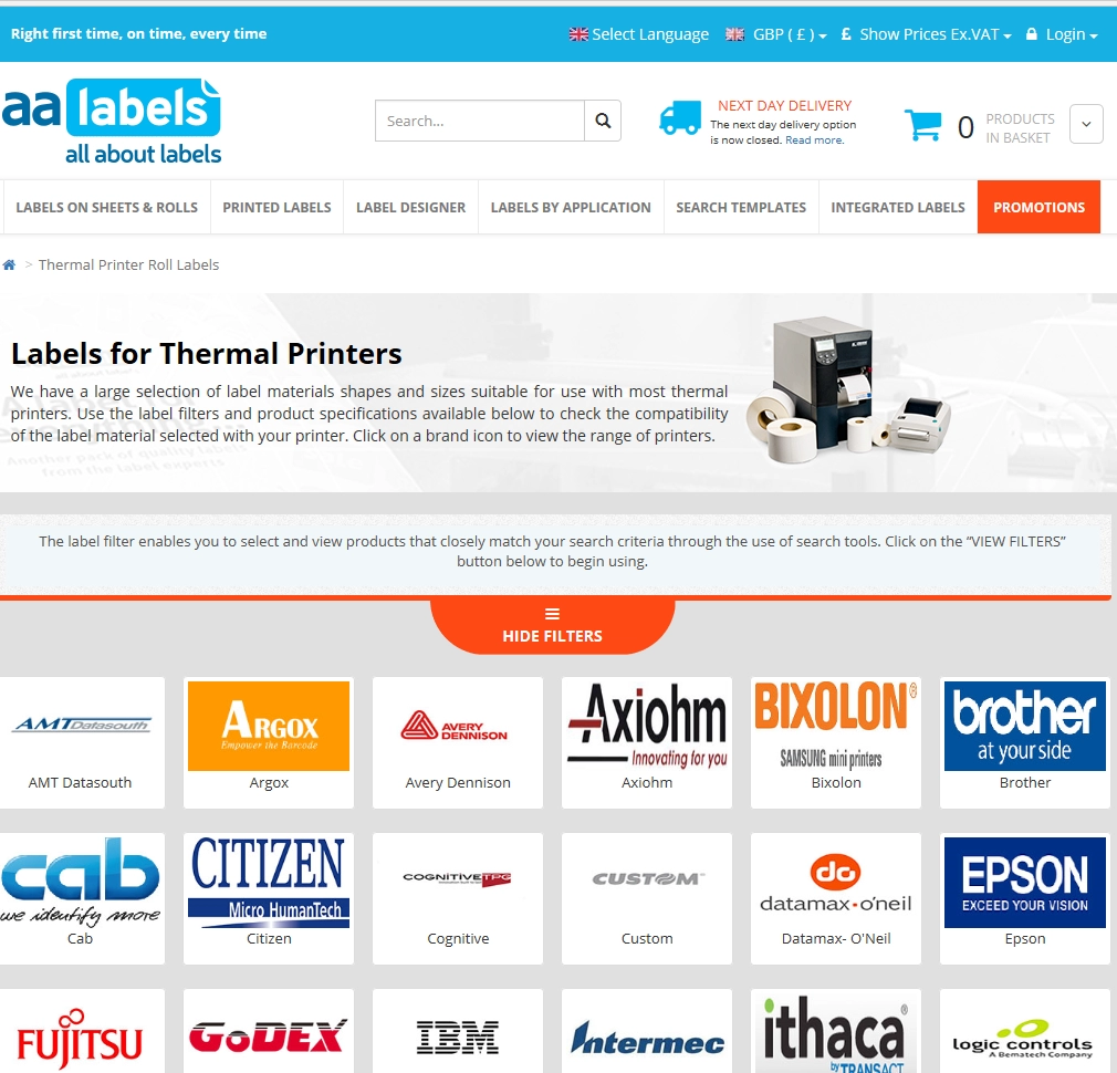 Lors d'une recherche par imprimante thermique pour la sélection d'étiquettes, la compatibilité de l'imprimante sera indiquée dans le résumé en haut de la page (Fig. 09), mais dans tous les cas, les différentes méthodes de recherche convergeront vers la page des matériaux où il existe un autre contrôle de compatibilité d'imprimante disponible via les icônes d'imprimantes (Fig. 10).