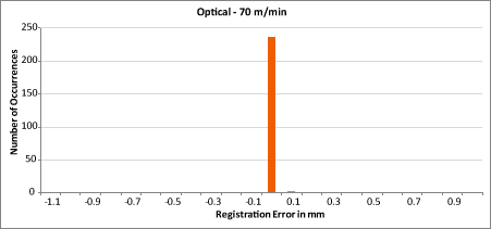 Les tableaux ci-dessous montrent l'emplacement (le repérage) de 240 étiquettes consécutives détectées par différents capteurs. Une seule barre au centre de chaque graphique indique que les 240 étiquettes ont été placées avec une précision de ± 0,05 mm. D'autres barres indiquent combien d'étiquettes ont été placées différemment (selon la hauteur de la barre) et dans quelle mesure elles ont varié (à quelle distance les barres se trouvent du centre du graphique).